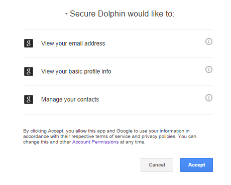 The very first step during the registration is to validate that you own the GMail mailbox and retrieve important account information that will be used for setting up your records in SecureDolphin system.